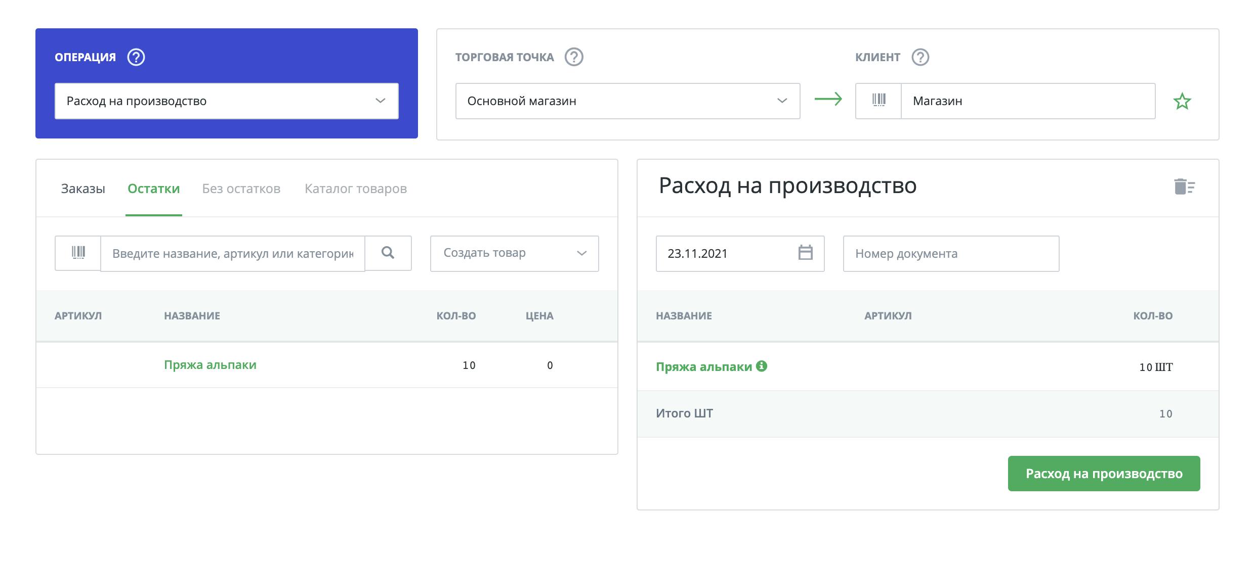 1. Сначала перейдите в раздел «Склад» и сделайте приход сырья и материалов на Торговую точку «Производство».
