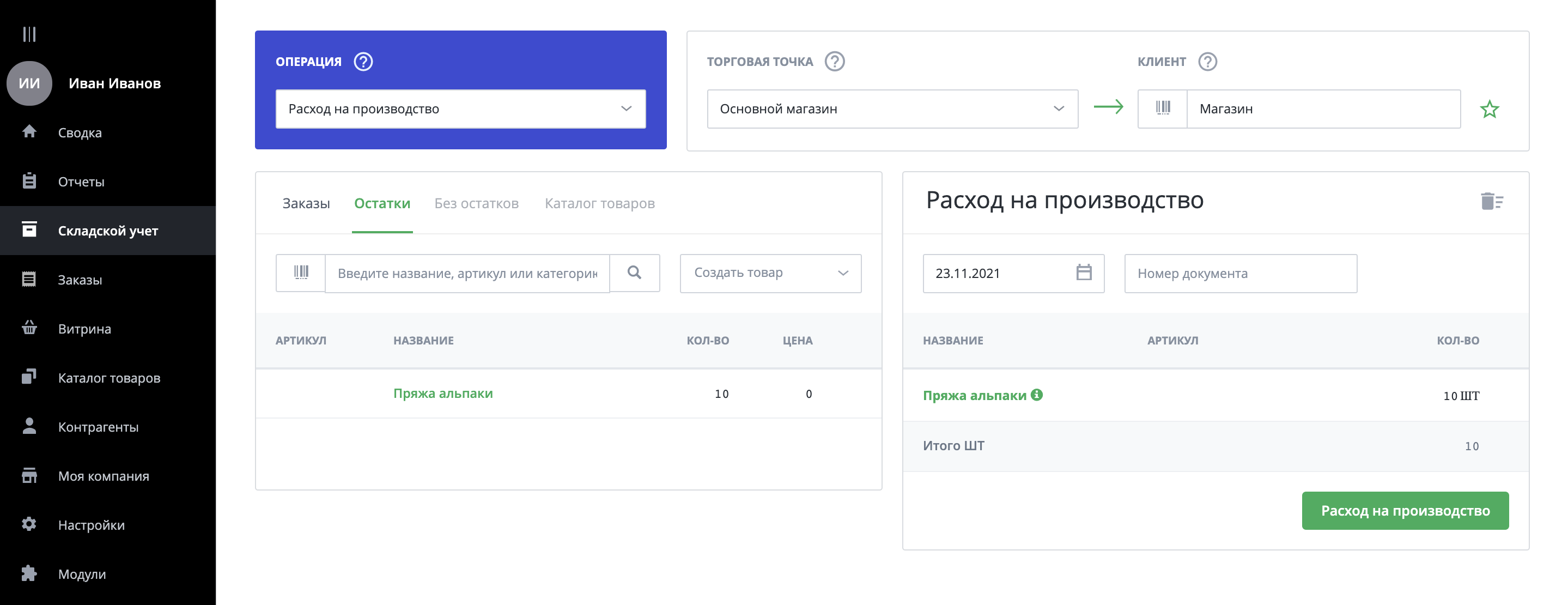 1. Сначала перейдите в раздел «Склад» и сделайте приход сырья и материалов на Торговую точку «Производство».
